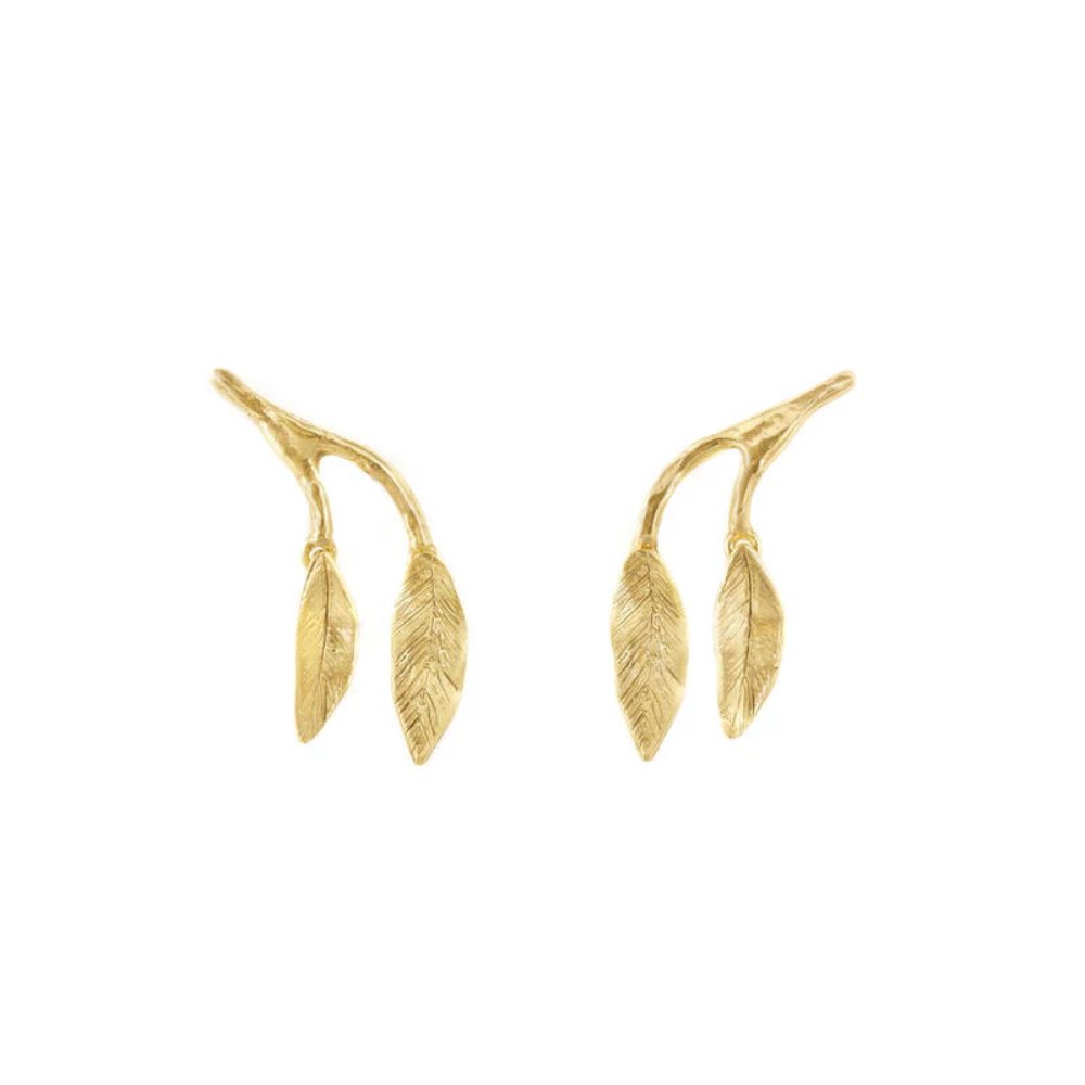 The Mobile Leaves Medium earrings follow the body's movements like a mobile sculpture, creating an elegant dynamism. The two leaves hang from a branch, adding a touch of naturalness. An accessory that celebrates the lightness of leaves and Giulia Barela's childhood memories. 24-karat gold-plated bronze. Code: A9714