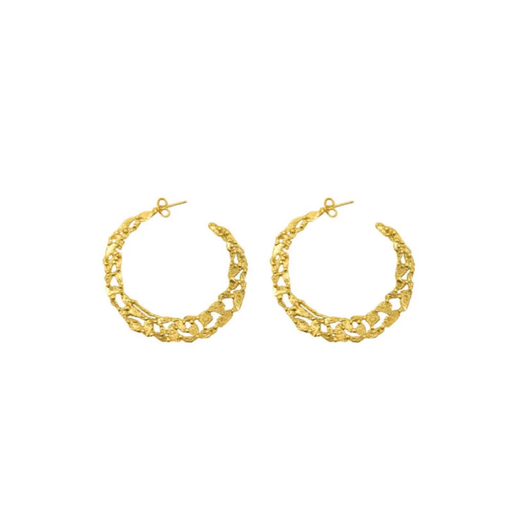 The Pebbles Medium Hoop earrings adorn the earlobe with a delicate touch, adding refinement to the face. Inspired by the texture of small joined pebbles, they evoke the connection between solids and voids, like a dialogue between nature and craftsmanship. A light and striking choice, handmade in Italy. 24-karat gold-plated bronze. Code: A3756