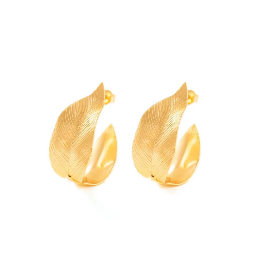 The Leaves Hoop Large earrings feature a leaf that delicately wraps around the earlobe, creating a circle of light around the face. Handcrafted, they combine the ancient technique of lost-wax casting with a modern and refined design. This piece captures and reflects the wearer's story. 24-karat gold-plated bronze. Code: A9721