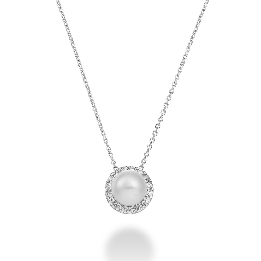White Gold Necklace with Pearls and Diamonds Diamond Color: G Pearl Color: White Diamond Ct.: 0.13 Pearl Shape: Spherical Pearl Luster: Excellent Pearl Size: Pearl Diam. 6-6.5 Diamond Clarity: VS Specifications: CL 18K FW 6/6.5 ct.0.13 Pearl Surface: Clean Diamond Cut: Brilliant Pearl Origin: Fresh Water