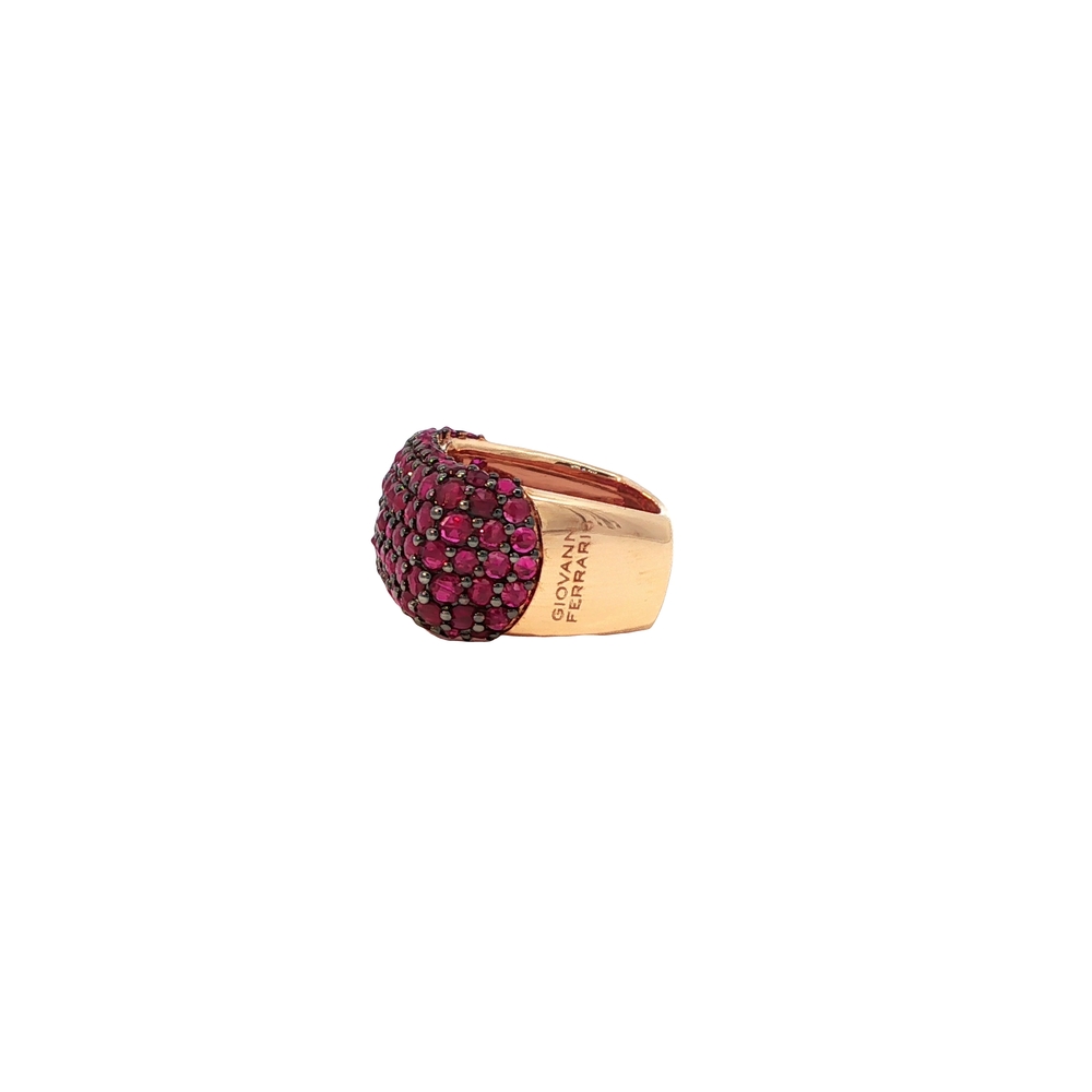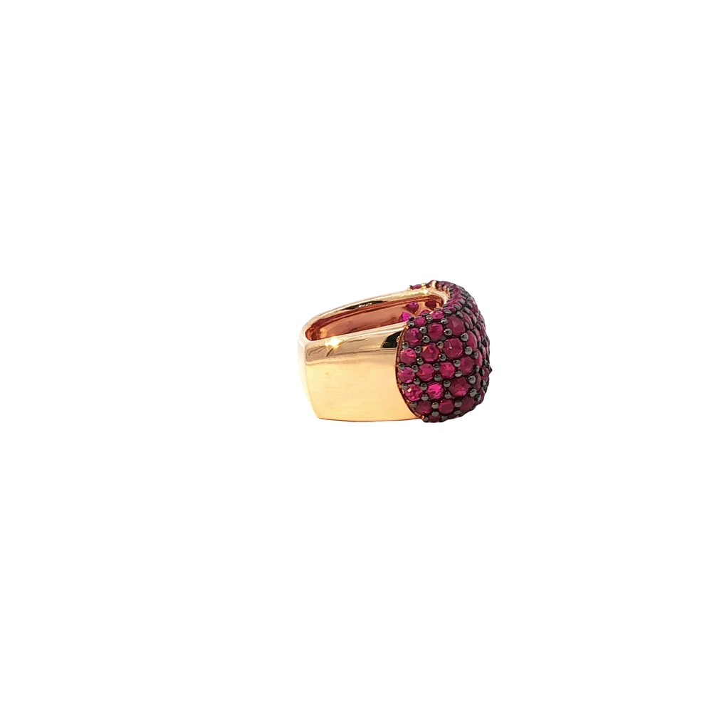 Explore timeless elegance with this band ring, adorned with rubies that catch the light with every movement. The intense red of the rubies, arranged in a continuous design, blends with the yellow gold finish, creating a luxurious and refined piece. A perfect accessory to add a touch of color and sophistication to your style. 13.30 Gr. Gold. Rubies 4.02 Ct.