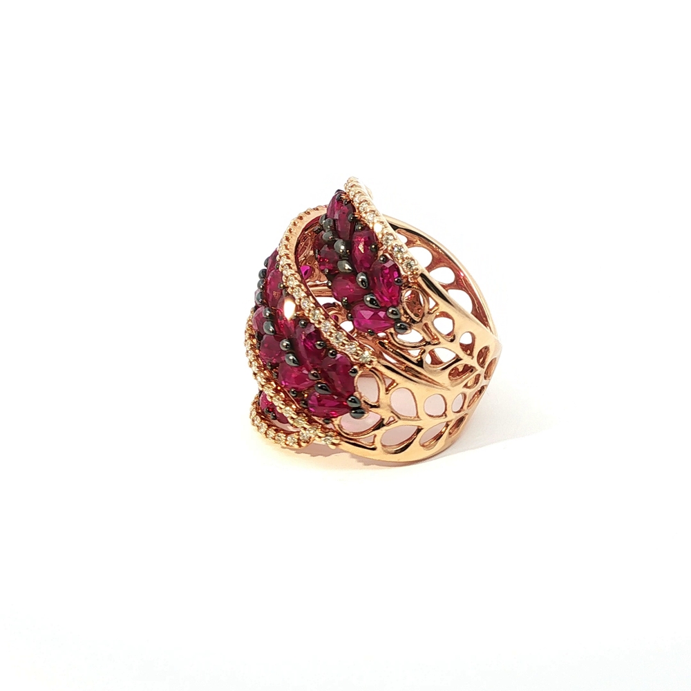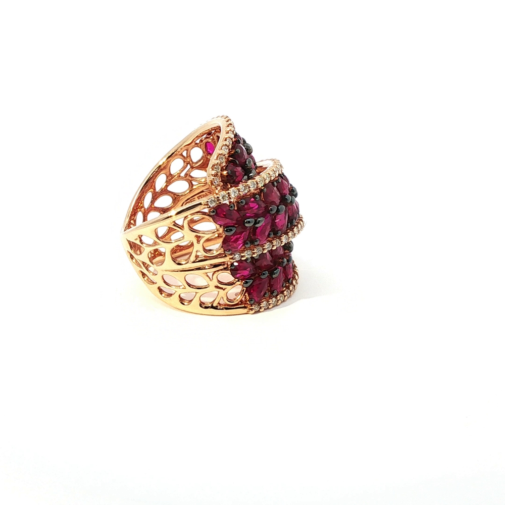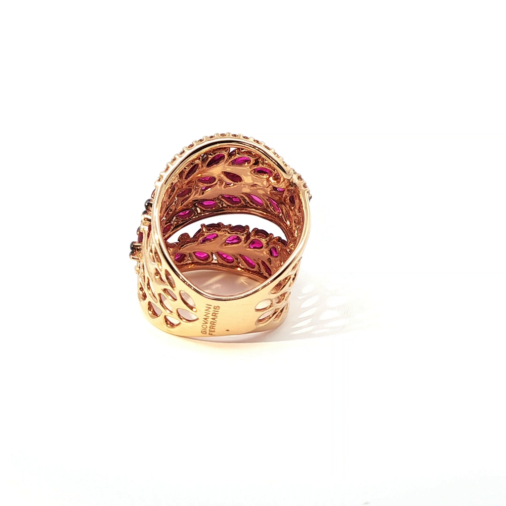 A bold and refined ring crafted in polished rose gold. The intricate design features red rubies arranged in a floral pattern. This brilliant gem, renowned for its clarity and intense color, lends timeless elegance to a piece perfect for special occasions. 15.10 Gr. Gold. 0.55 Ct. Rubies.
