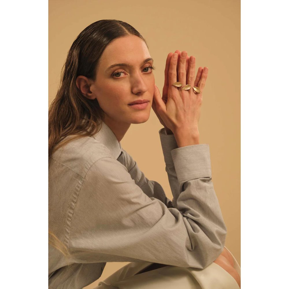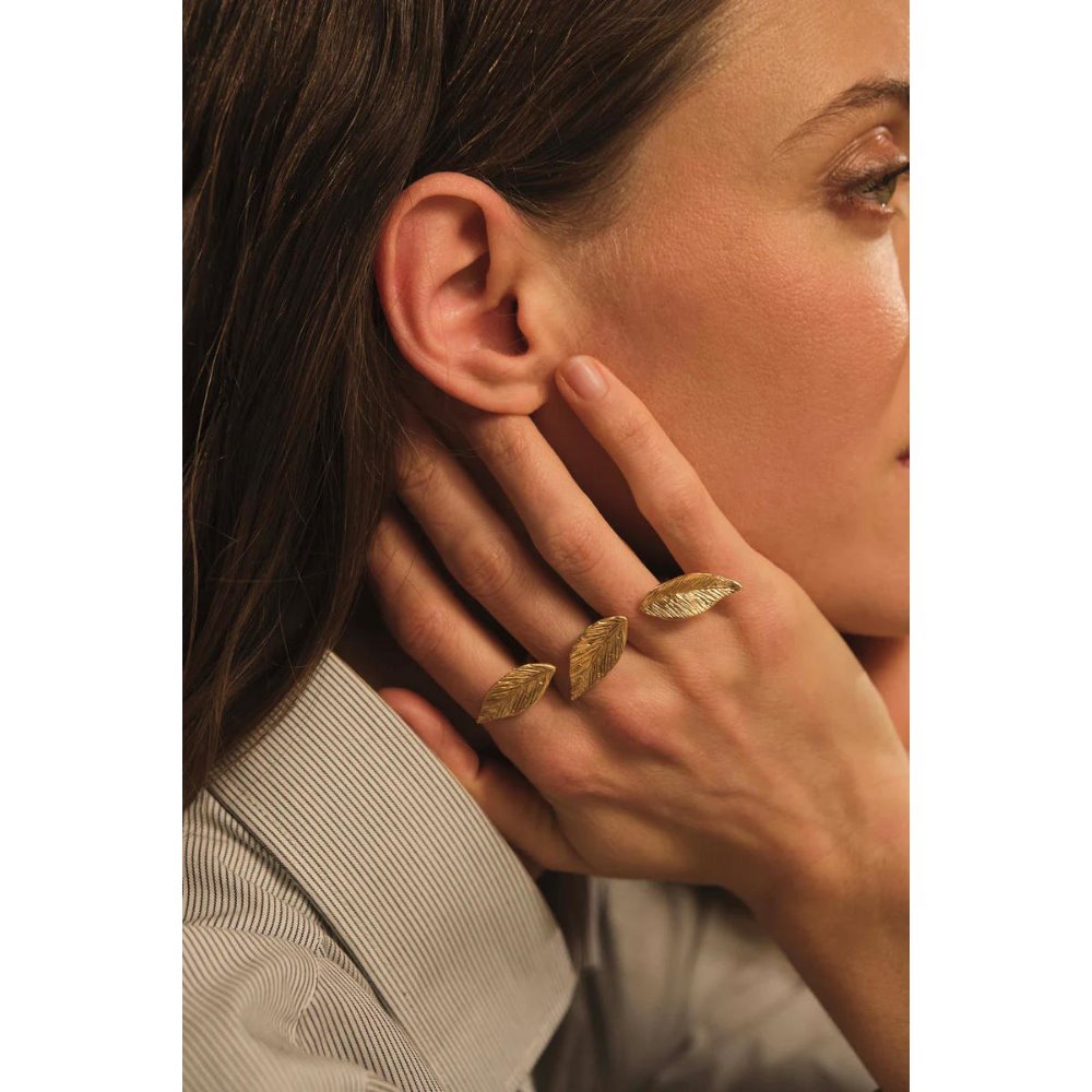 Three delicate leaves embrace the fingers, giving elegance and a natural touch. A wearable work of art, perfect for those who love the lightness of nature. 24-karat gold-plated bronze. Code: C2711. Size M (12-15).