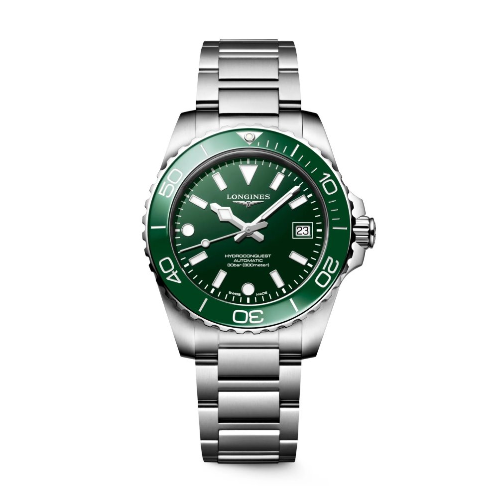 Automatic watch, Ø 42.00 mm, stainless steel and ceramic bezel, L3.788.4.06.6 Date, self-winding mechanical movement beating at 25,200 vibrations per hour and offering approximately 72 hours of power reserve, monocrystalline silicon balance spring. Screw-down crown, unidirectional rotating bezel, water resistant to 30 bar, scratch-resistant sapphire crystal with multilayer anti-reflective treatment on both sides. Glossy green lacquered dial, Swiss Super-LumiNova®. Stainless steel bracelet with double folding safety clasp and micro-adjustment system.