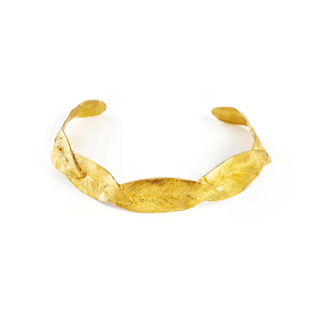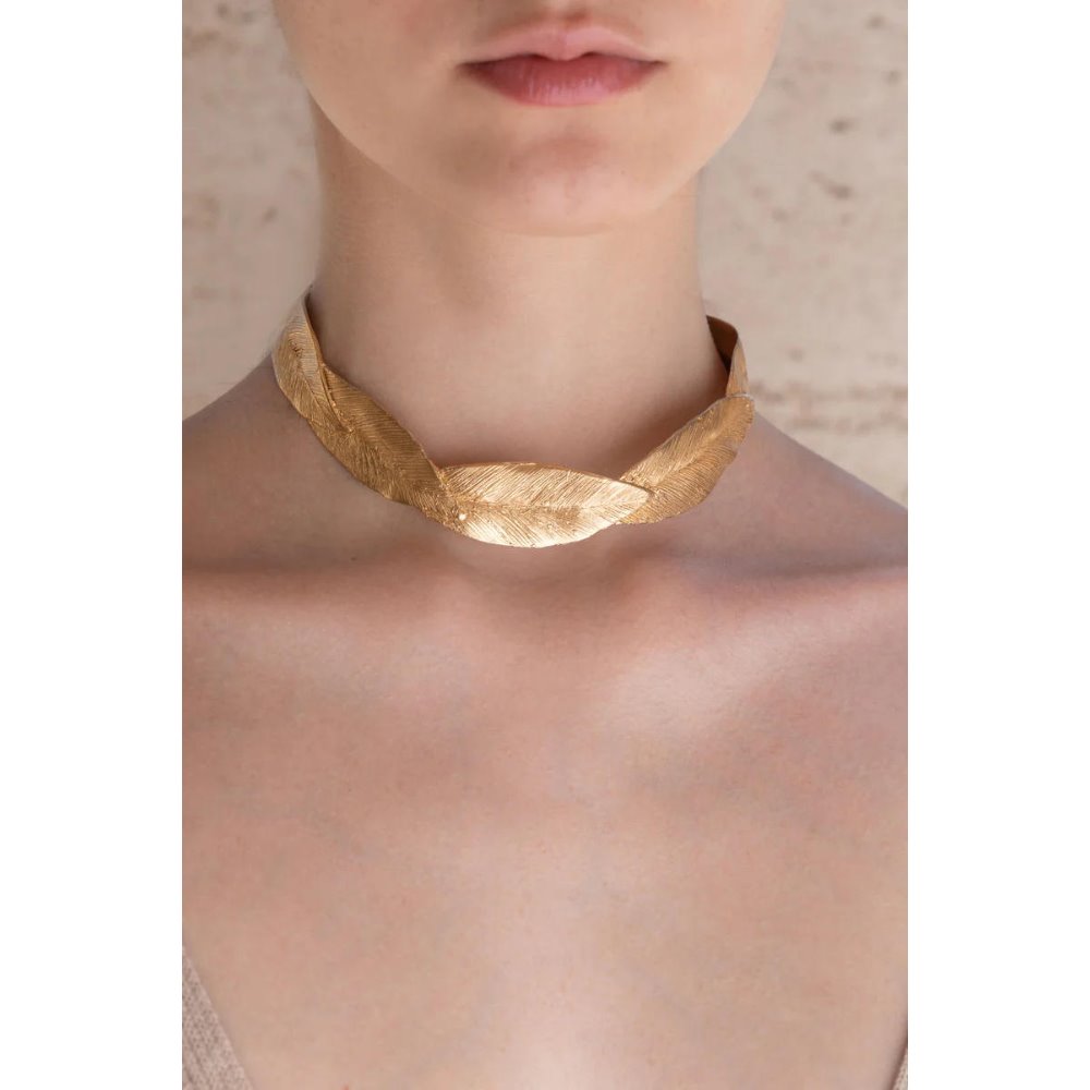 Un elegante y versátil collar, ajustable en el escote, con diminutas incisiones que recuerdan la textura natural de las hojas. Perfecto para un look cotidiano o una ocasión especial, transforma lo ordinario en extraordinario. Cada hoja, moldeada y grabada individualmente, expresa la armonía entre naturaleza y arte. Bronce chapado en oro de 24 quilates. Código: D2713