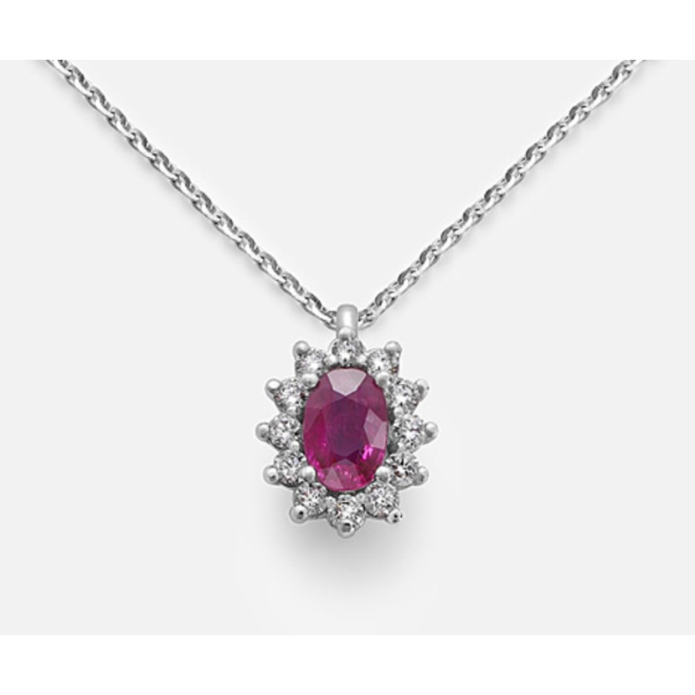 Collar de oro blanco con rubí natural ovalado de 6x4 y diamantes. Color del diamante: G. Cantidad de diamantes: 0,23 ct. Color de las piedras: 0,39. Gema: Rubí natural. Claridad del diamante: SI.