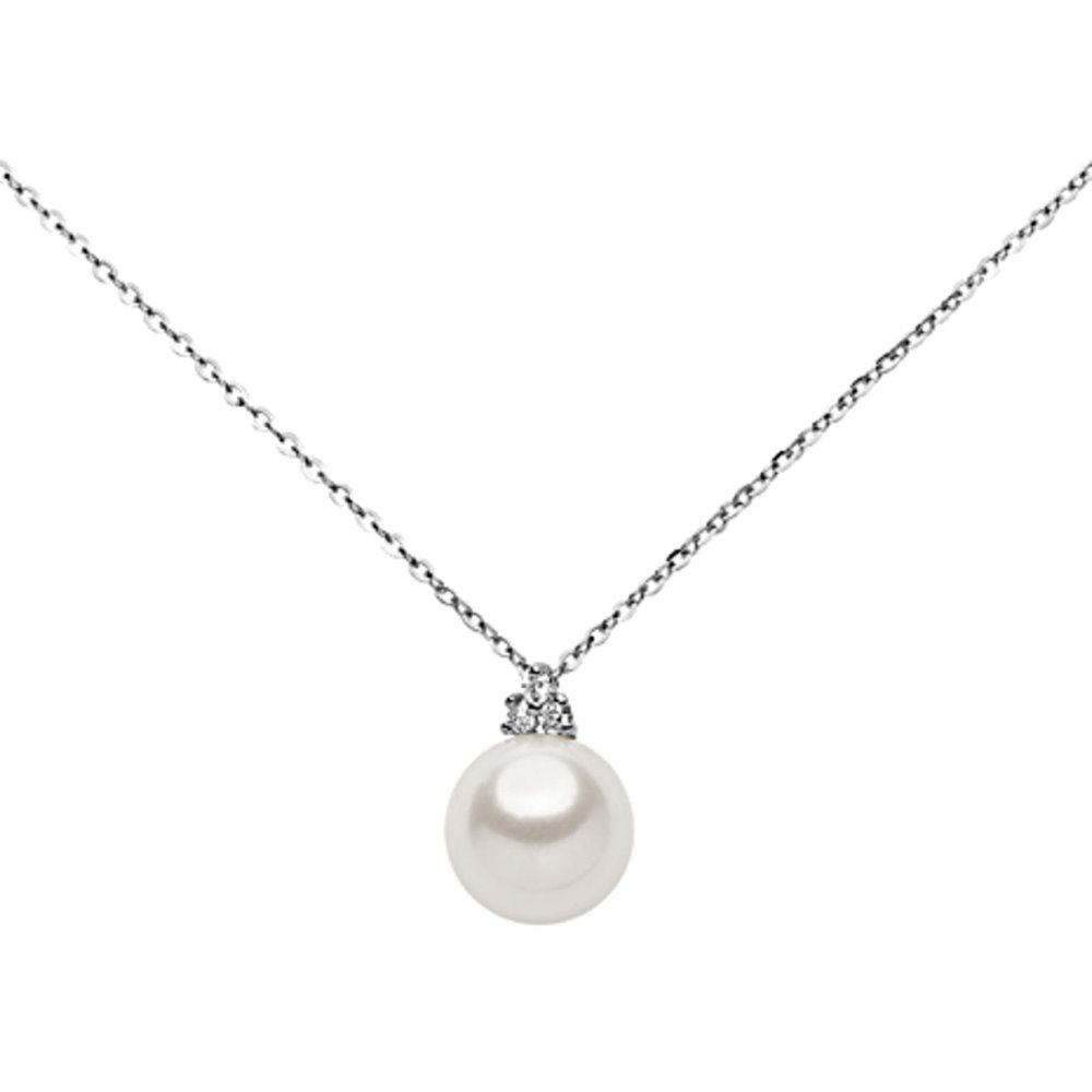 Collar de oro blanco con perla fw 8/8.5 y diamantes 0.03 Ct. Color del diamante: G. Color de la perla: Blanco. Peso del diamante: 0.03 Ct. Forma de la perla: Esférica. Brillo de la perla: Excelente. Claridad del diamante: VS2. Superficie de la perla: Limpia. Talla del diamante: Brillante. Origen de la perla: Agua dulce.