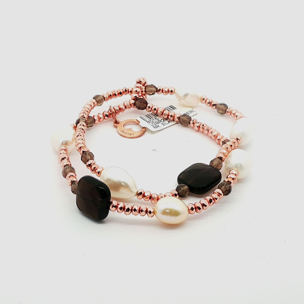 Pulsera elástica de plata con dos hileras de perlas y hematita negra.