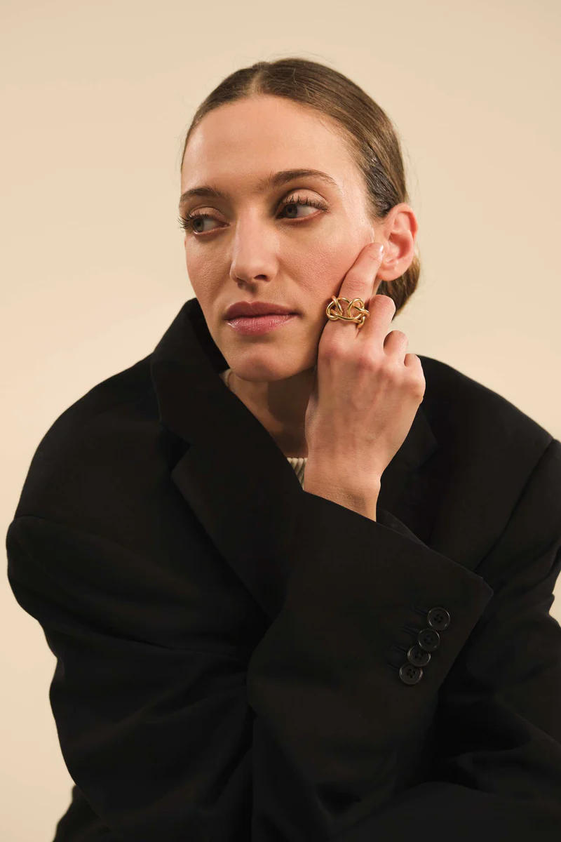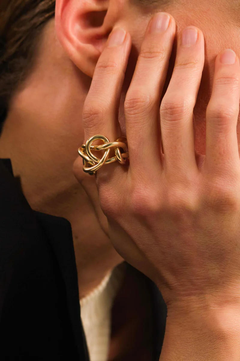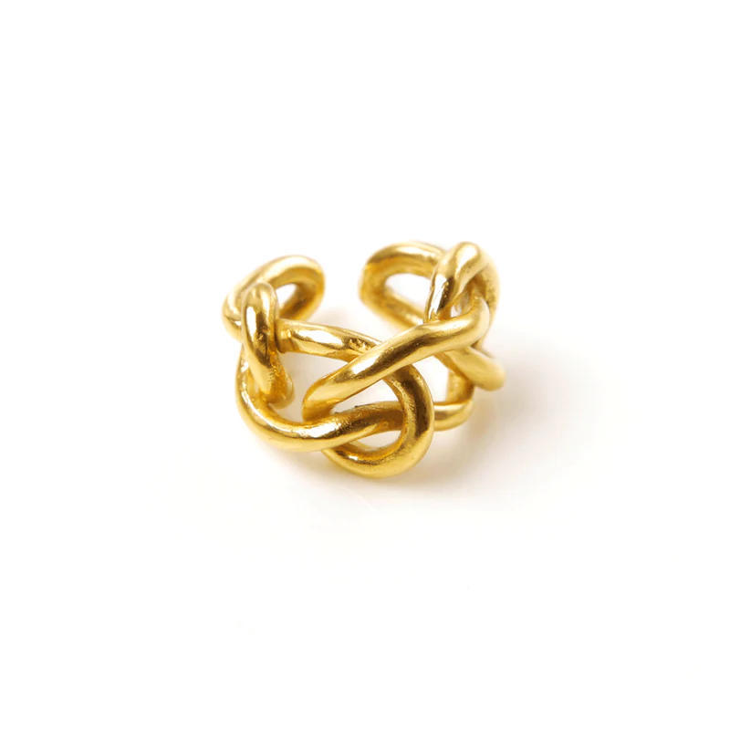 Un nœud doré orne le doigt, lui conférant une présence unique. Symbole de liens indéfectibles, il est idéal pour affirmer son style. Un bijou qui exprime la force des relations. Bronze plaqué or 24 carats / argent sterling 925. Code : C1718