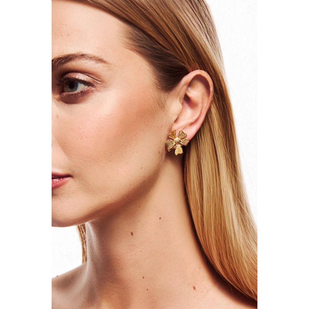 Une petite fleur, un signe délicat et précis. Les boucles d'oreilles Myosotis sont simples et pourtant pleines de caractère : leur format compact les rend immédiates, quotidiennes et jamais banales. Un détail qui reste près de la peau, comme un message personnel que vous choisissez d'emporter partout avec vous. Bronze plaqué or 24 carats. Code : A13716