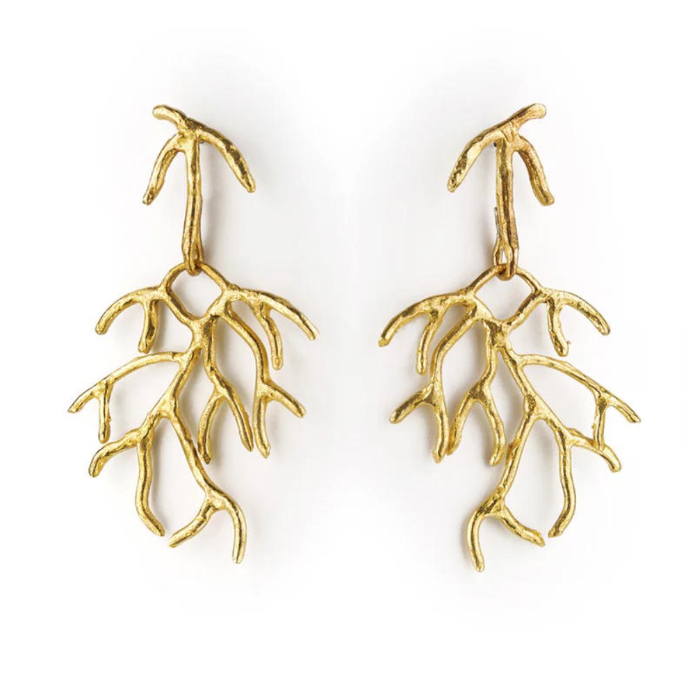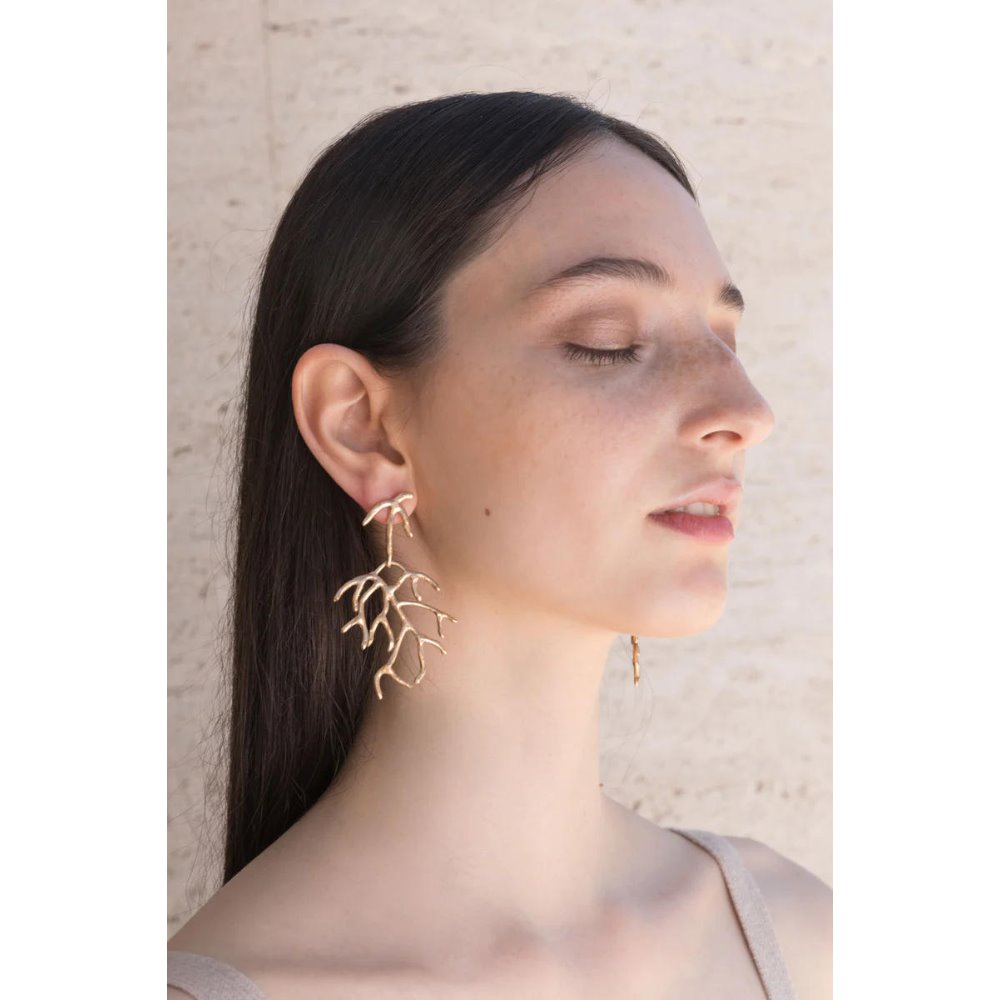 Ces boucles d'oreilles, aux formes sinueuses, évoquent l'esthétique de la nature. Confectionnées en bronze plaqué or et argent, elles ondulent comme des branches au vent. Idéales pour celles qui recherchent une touche à la fois naturelle et sophistiquée. Bronze plaqué or 24 carats. Code : A2718