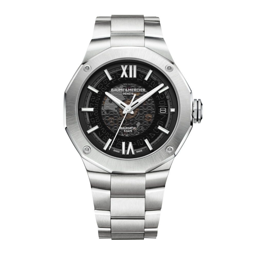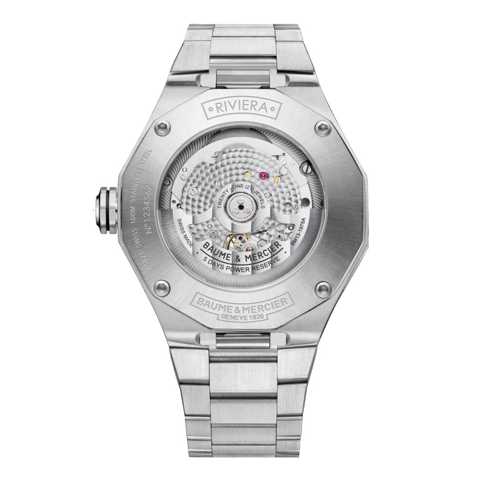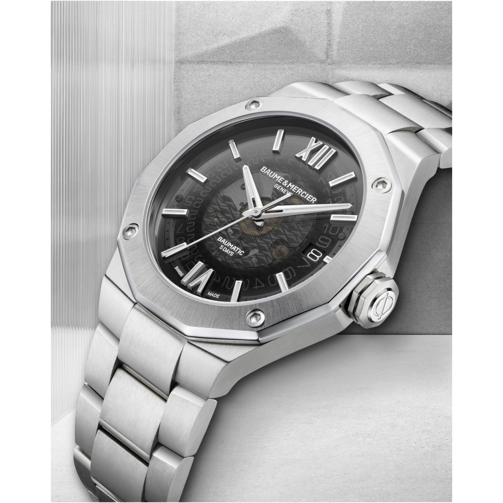 La version 2022 de la Riviera Baumatic est disponible avec un cadran en verre saphir gris fumé et un bracelet en acier intégré. La décoration introduite en 2021 est devenue la marque de fabrique de ces modèles, chacun équipé d'un mouvement Baumatic Manufacture. Sa transparence offre une vue sur les rouages du calibre Baumatic aux performances éprouvées. Impeccable non seulement d'un point de vue technique, ce garde-temps cherche à répondre aux attentes de ses futurs propriétaires en visant l'excellence, le style, le confort et la cohérence dans tous ses éléments. En un mot : il incarne la vision de la Maison sur l'horlogerie masculine.