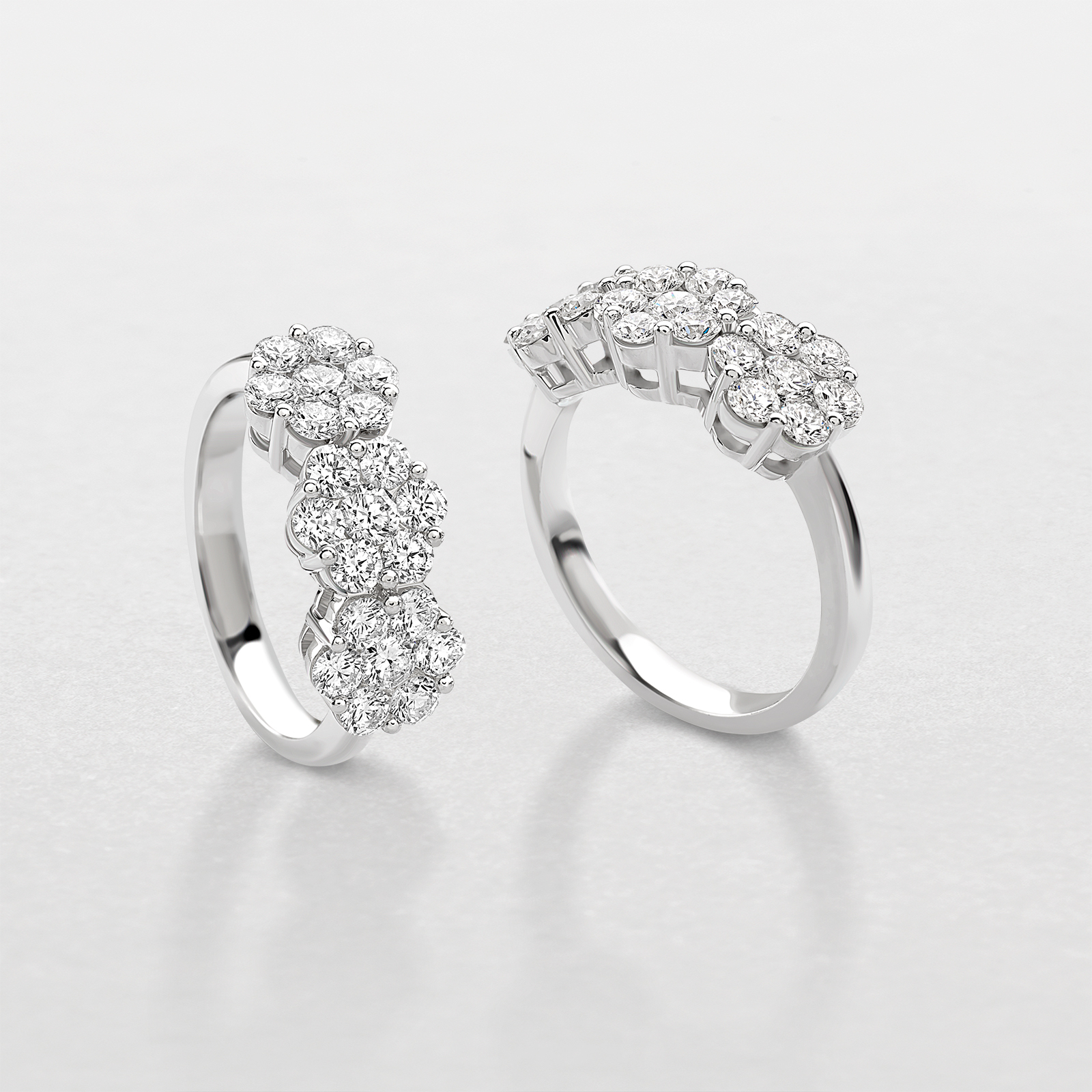 Anel Trilogy em ouro branco com contorno e diamantes de lapidação brilhante. Ouro Gr 1,80. Diamantes 0,43 ct. FGVS.