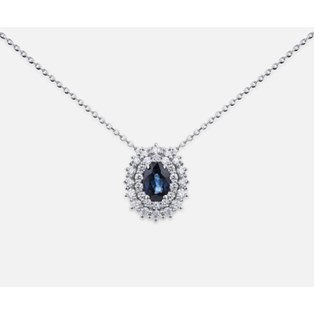 Colar em ouro branco com safira natural oval 6x4 e diamantes. Cor do diamante: G. Quilates dos diamantes: 0,37. Cor das pedras: 0,67. Gema: Safira natural. Pureza do diamante: VS. Lapidação do diamante: Brilhante.